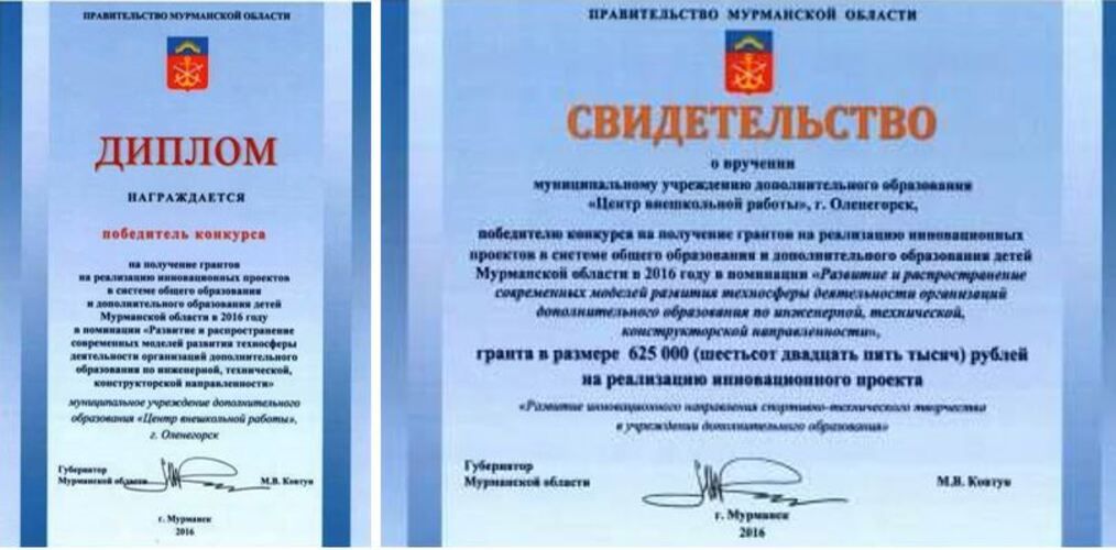 Победитель конкурсного отбора на реализацию программ индивидуального сопровождения обучающихся Мурманской области, достигших высоких результатов в научно-исследовательской, изобретательской и проектной деятельности (протокол Министерства образования и науки МО от 29.02.2024 № 2). Сумма гранта 125 000 руб.